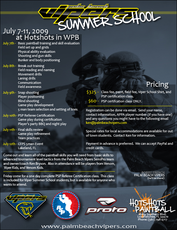 Florida paintball players rejoice! The Palm Beach Vipers are hosting their 2009 paintball summer school July 7th-11th at Hot Shots Paintball Park in Loxahatchee, FL. Vipers coach Ken Bryson has planned out an action packed week in which players will learn critical skills such as proper break outs and lane shooting, effective communication, and focusing on game play development. As an added bonus, the Palm Beach Vipers will be hosting a PSP Referee course and all participants of the summer school will exit the course qualified to both compete and referee in a PSP national X-ball event.